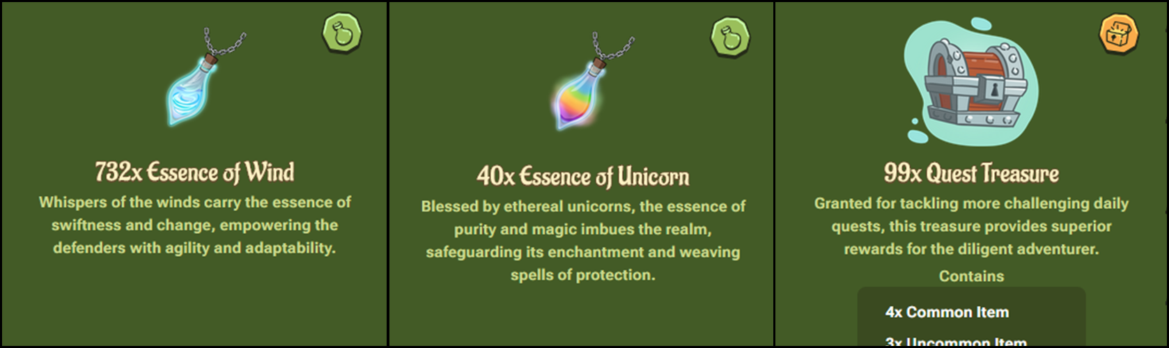 * <img src="https://3672031882-files.gitbook.io/~/files/v0/b/gitbook-x-prod.appspot.com/o/spaces%2Ffhcard3pcDD5EMvVesel%2Fuploads%2FU22xV1NozhXNqrimyM6F%2Fimage.png?alt=media&#x26;token=f51b5ccf-bf88-4d06-b75c-e9d107027511" alt="" data-size="line"> **Treasures**: Contain rewards when opened.